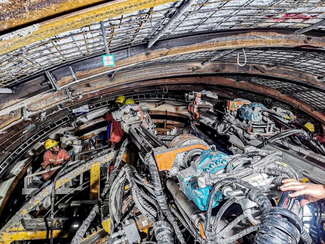 “云岭号”TBM(直径9.83米)自2021年1月24日通过巨石充填型特大溶洞不良地质段以来,日掘进进度不断冲刺攀升。4月19日,“云岭号”TBM实现了单班最高进尺20.6米,单日最高进尺38.6米(全拱架支护段围岩条件),今日,又创下了TBM国内同级别洞径单月最高进尺纪录。
