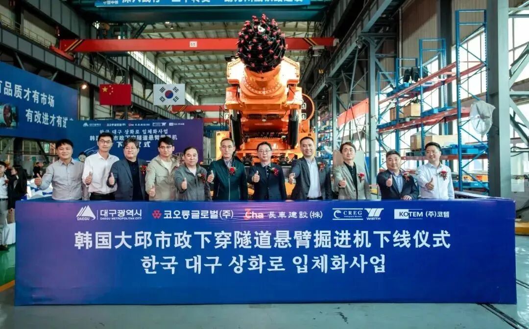 韩国大邱市城建本部科长赵晟煜、组长金时亨、主务官郭起赫,韩国建设事业管理团监理蔣承旻,韩国科隆建设现场所长尹晟浩、公务组长文永洙、施工科长李宰圭,韩国长车建设现场所长曹泳三、装备组长卢钟大,韩国KOTEM董事长金宰永,集团公司党委副书记、总经理张志国,副总工程师、国际事业部霍磊,以及设备公司相关领导出席下线活动。