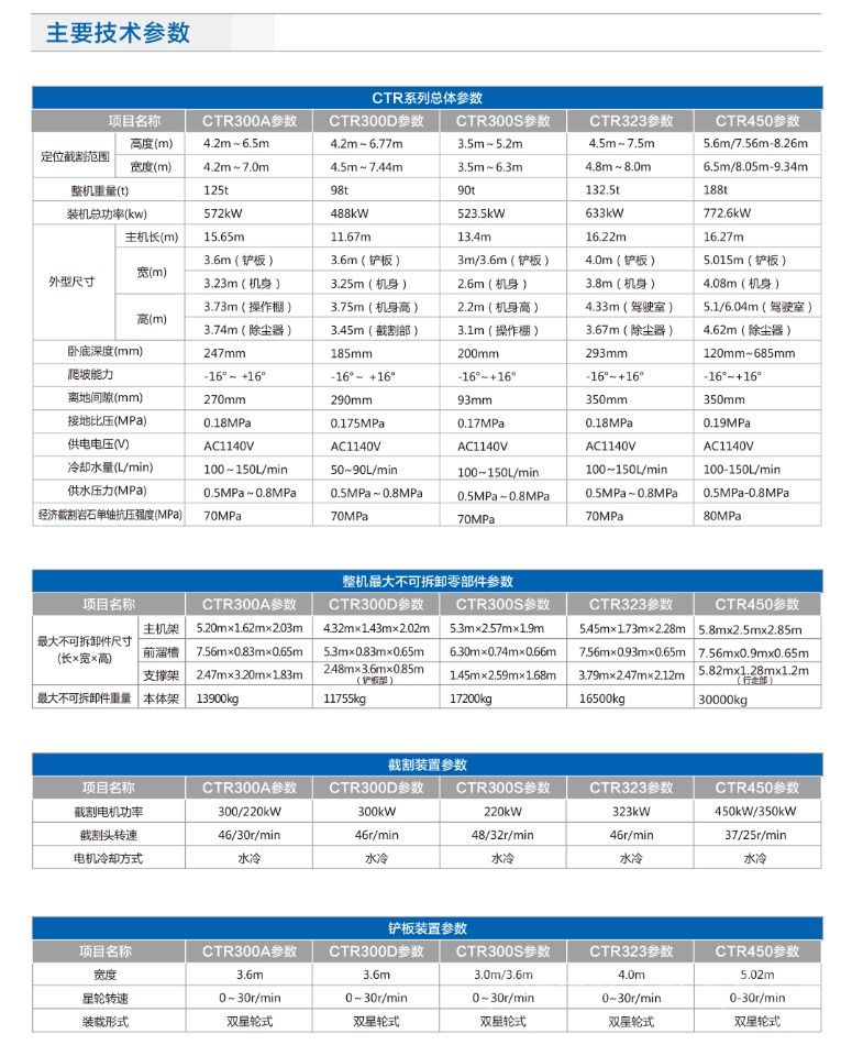 目前主推产品为CTR300A(硬岩型)、CTR300D(地铁型)、CTR300S(水利型)、CTR323(硬岩型)、CTR450(高原型)等系列产品,超大开挖高度为6.5m-8.5m,适用于Ⅳ~Ⅴ级围岩台阶法或环形开挖预留核心土施工非爆开挖,扰动小,超欠挖易控制,可同步开展其他工序。作业效率20-100m3 /h,围岩强度一般<120MPa。